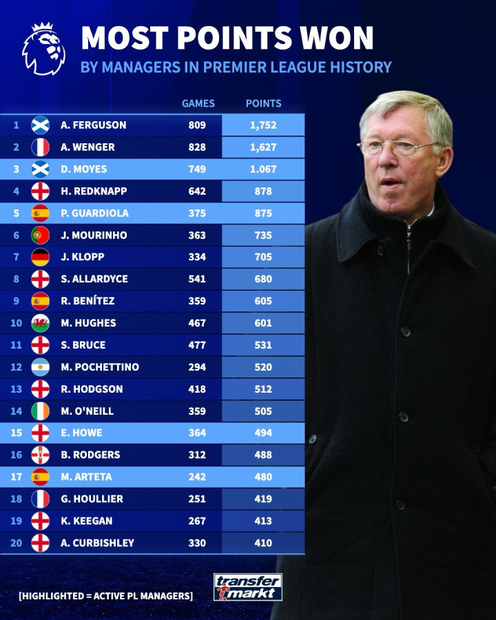 弗格森和温格分别获得1752和1627分排名前二,现埃弗顿主帅莫耶斯则排名榜单第三位。瓜迪奥拉、埃迪-豪和阿尔特塔则分别排在第五、第十五和第十七位。
